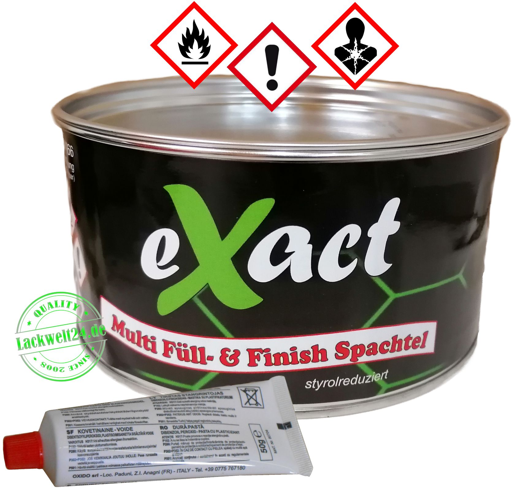 eXact Multispachtel styrolreduziert ist ein Füll- und Finishspachtel mit Haftung auf Stahlblech, verzinkten Blechen, Aluminium, verzinnten Flächen und GFK. Kurze Trockenzeit und leichte Schleifbarkeit sind weitere Merkmale dieses Spitzenprodukts. Der Styrolanteil des Multispachtels styrolreduziert liegt bei <10%.